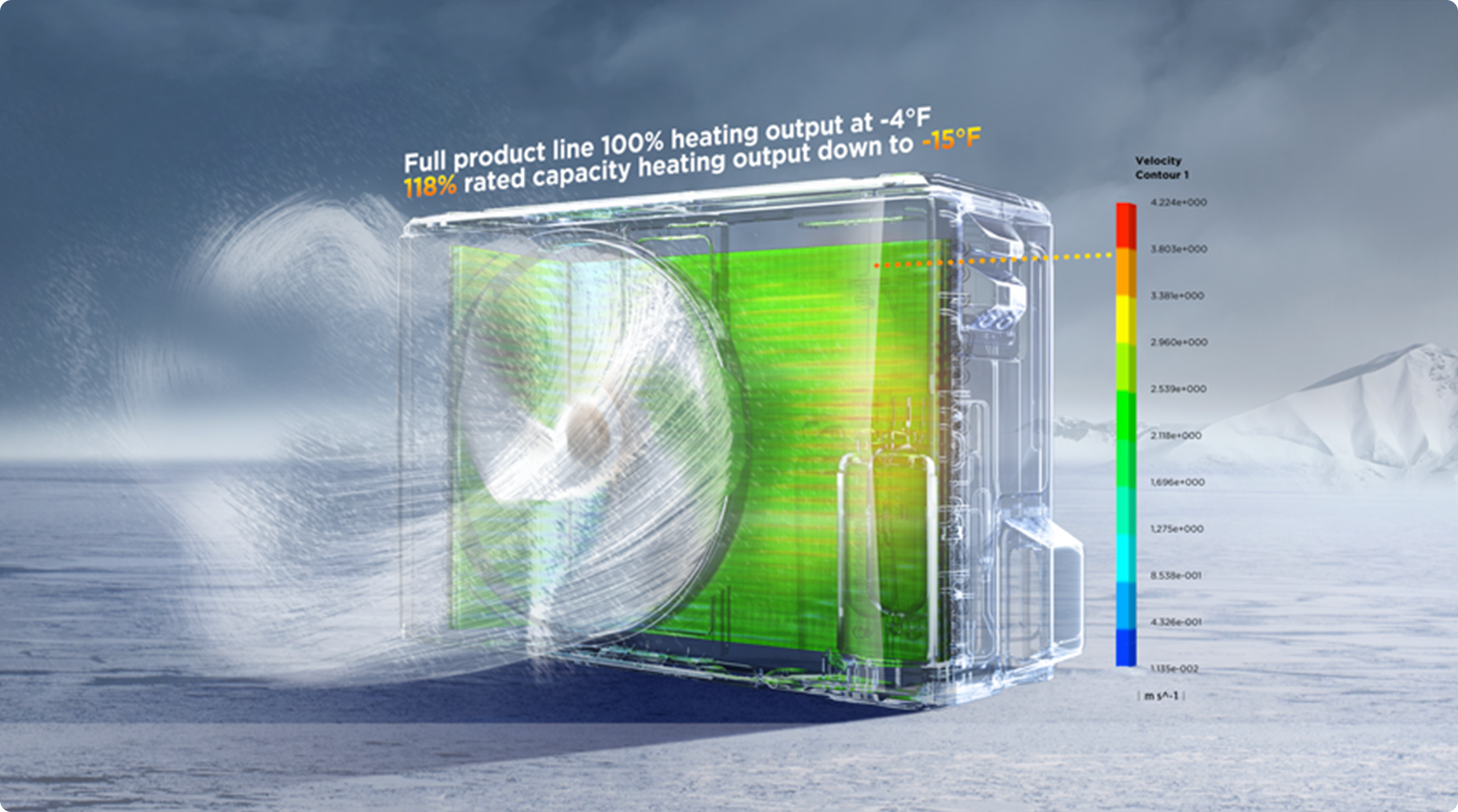 The unit structure with horizontal fan and vertical heat exchanger guarantee more uniform and efficient heat exchanging velocity across the entire heat exchanger surface. When the temperature gets low, the system shows higher heat exchanging efficiency and provides stronger heating output.
